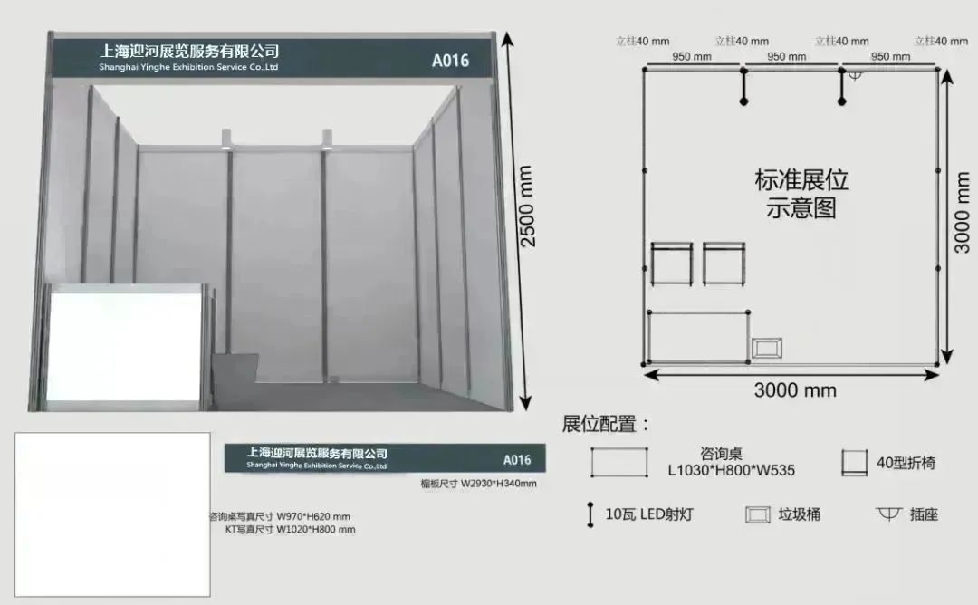 注:標準展位(包括:三面圍板、地毯、一桌二椅、二只射燈、220V/500W電源插座一個。)雙面開口標準展位加收RMB2000元。